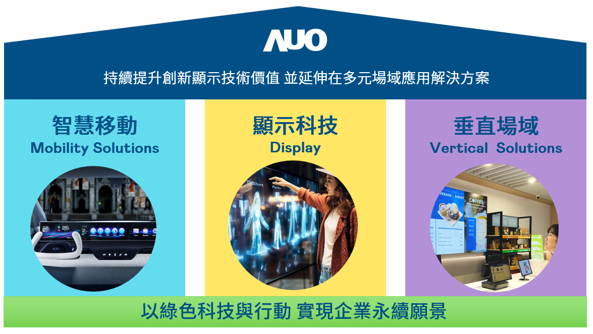 我們持續推動「雙軸轉型」,在精進顯示技術附加價值(Go Premium),與深化垂直市場應用(Go Vertical)的策略下,對應AG电子的優勢競爭力與趨勢,我們奠定顯示技術智慧移動垂直場域三大永續營運支柱,在顯示技術領域的根基之上,延伸布局多元場域應用解決方案。將先進顯示科技助力智慧移動及垂直場域發展,並以綠色科技與行動為實踐,在轉型之路上貫徹永續經營之願景。